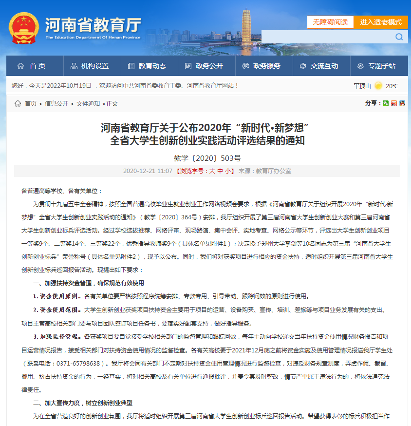 2020年毕业生杨超飞荣获河南省第三届大学生创新创业标兵