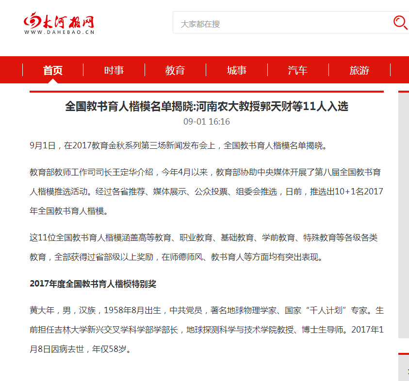 2017年郭天财荣获全国教书育人楷模荣誉称号