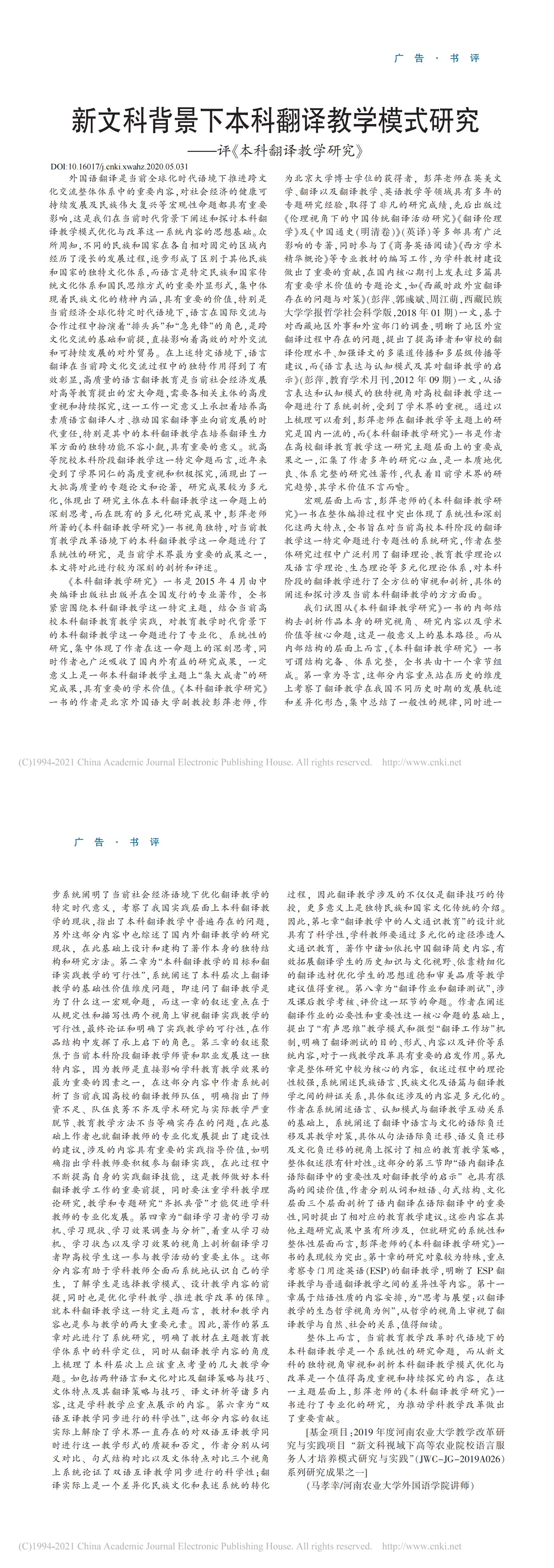 (北大核心、CSSCI扩展版)新文科背景下本科翻译教学模式研究,《新闻爱好者》,2020年第5期,马孝幸