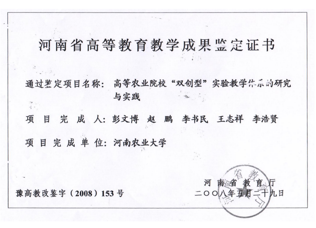 河南省教育教学成果鉴定高等农业院校“双创型”实验教学体系的研究与实践