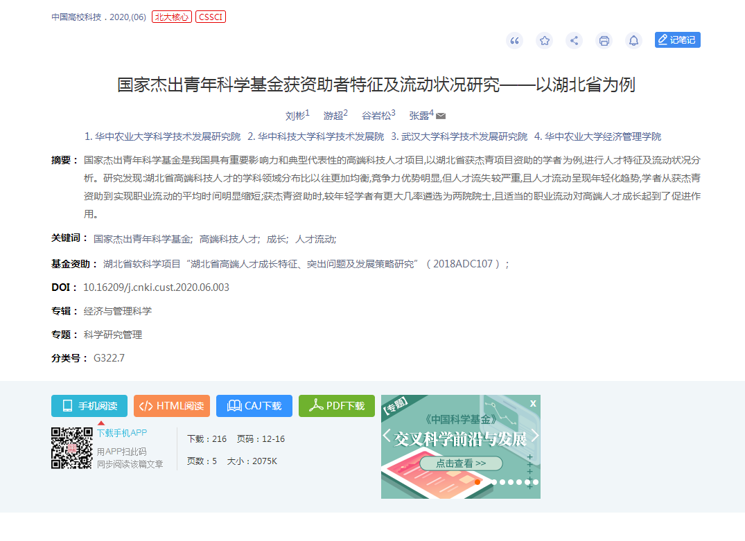 刘彬,C刊《中国高校科技》杂志发表题为《国家杰出青年科学基金获资助者特征及流动状况研究——以湖北省为例》的论文