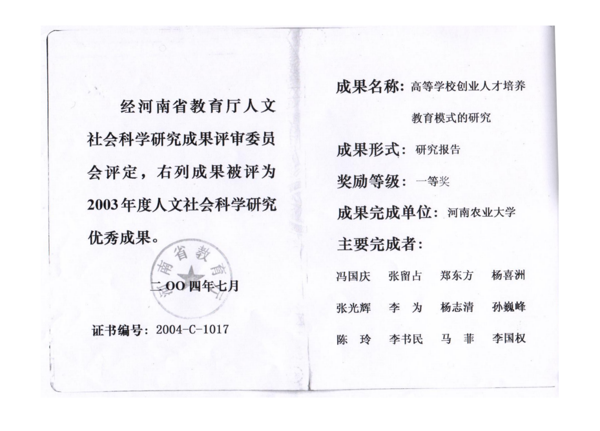 河南省人文社会科学研究成果一等奖:高等学校创业人才培养教育模式的研究