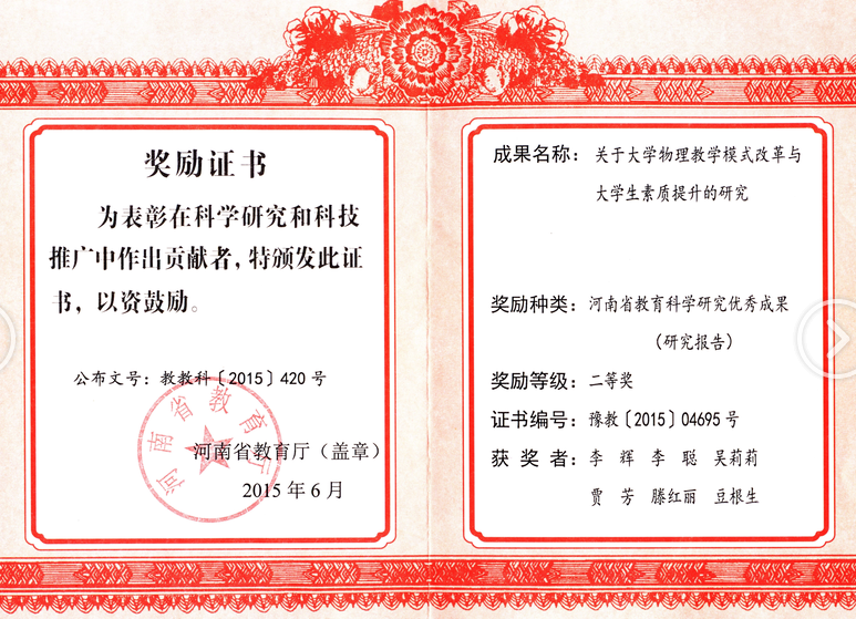 关于大学物理教学模式改革与大学生素质提升的研究——河南省教育科学研究优秀成果二等奖
