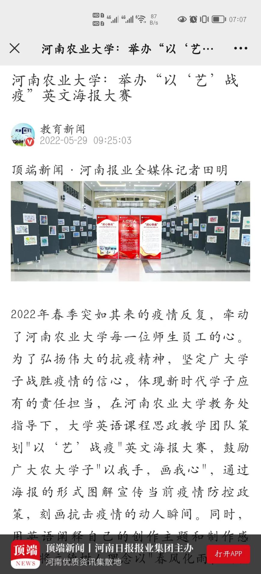 河南日报顶端新闻:河南农业大学举办以“艺”战“疫” 英文海报大赛