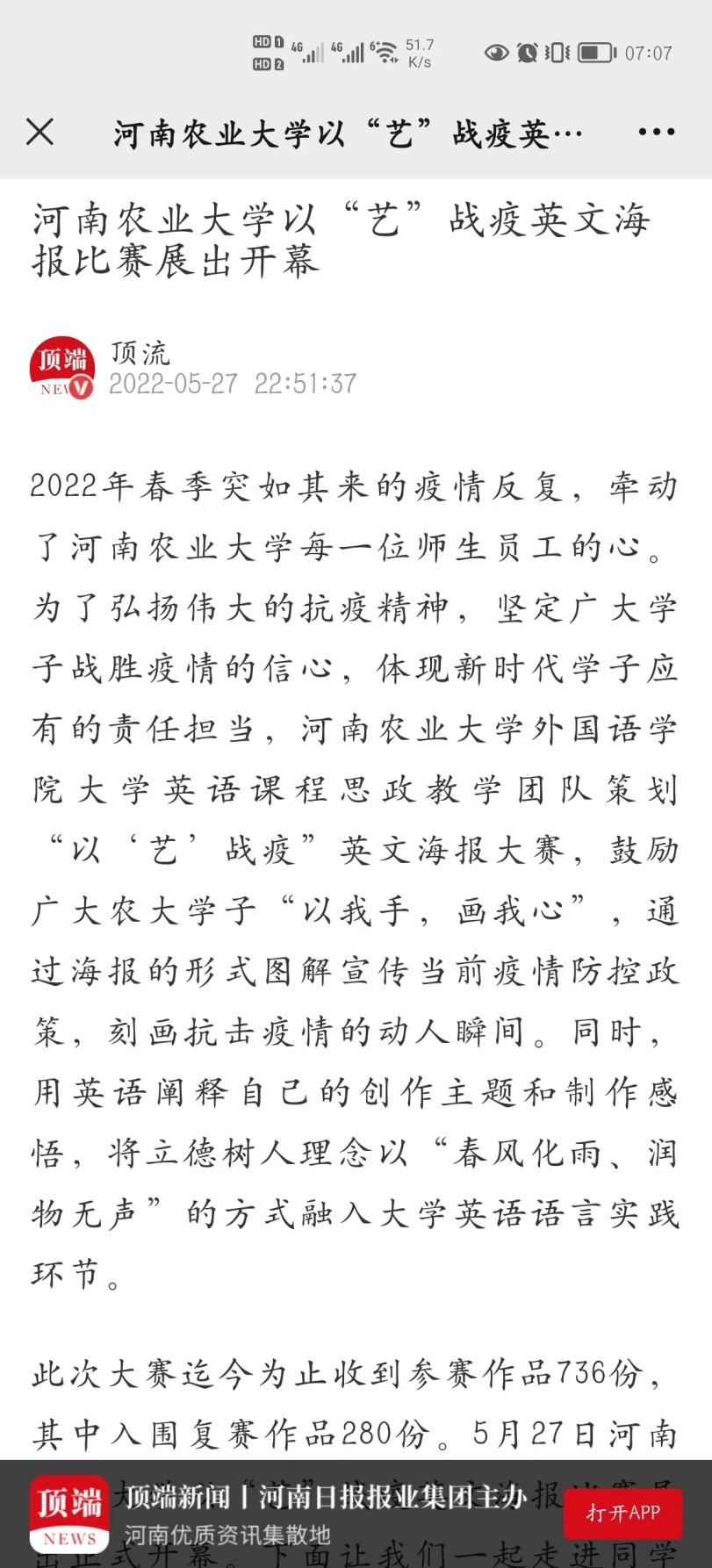 河南日报顶流新闻: 河南农业大学以“艺”战疫英文海报比赛展出开幕