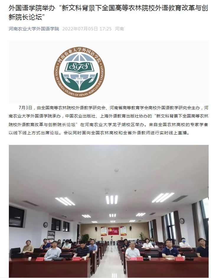 河南农业大学外国语学院网站:外国语学院举办“新文科背景下全国高等农林院校外语教育改革与创新院长论坛”