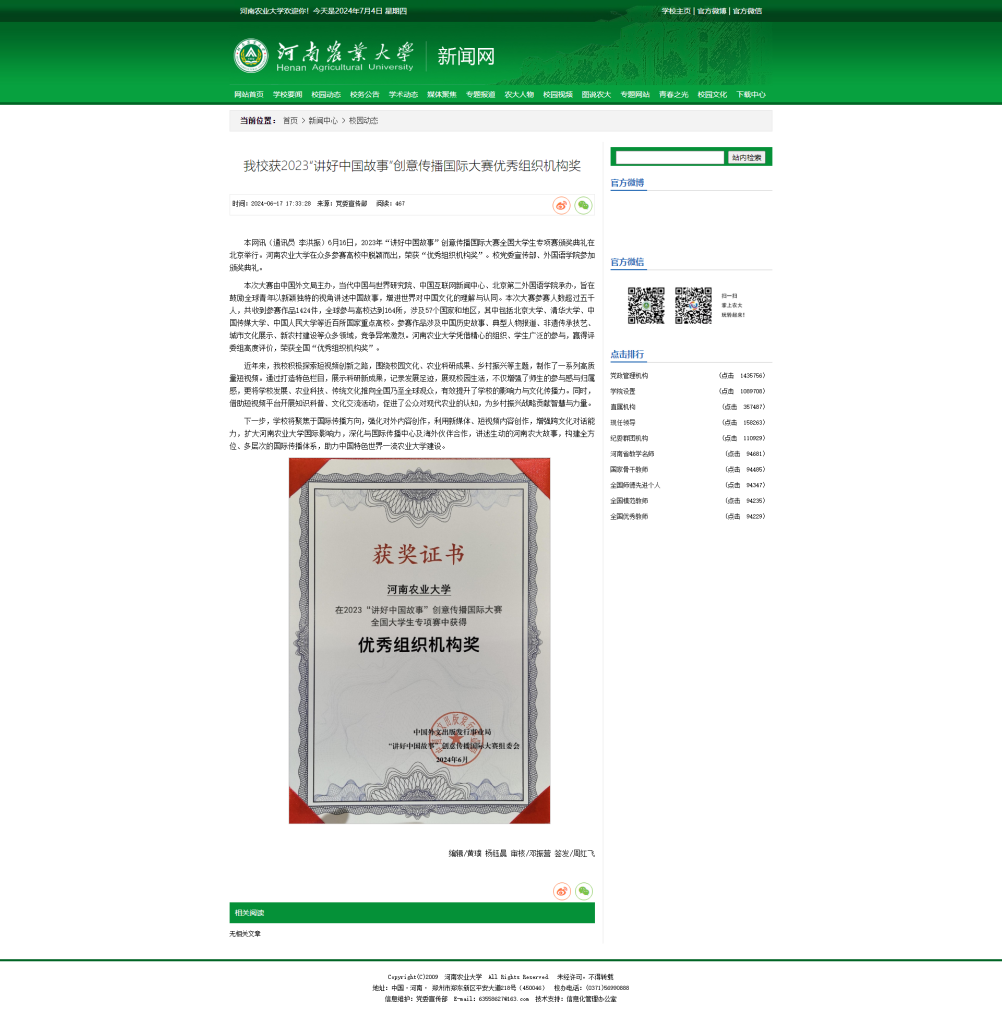 河南农业大学官网:我校获2023“讲好中国故事”创意传播国际大赛优秀组织机构奖